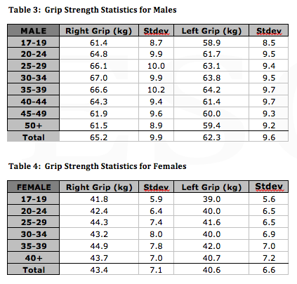 Mean grip strengths are computed and displayed with standard deviations from each 5-year age group for both male and females in Table 1 and Table 2. An attempt was made to gather a substantial number of candidates in each category for the creation of standards, but the scarcity of the female candidates data made it difficult to find adequate representation, particularly in age groups beyond 40.